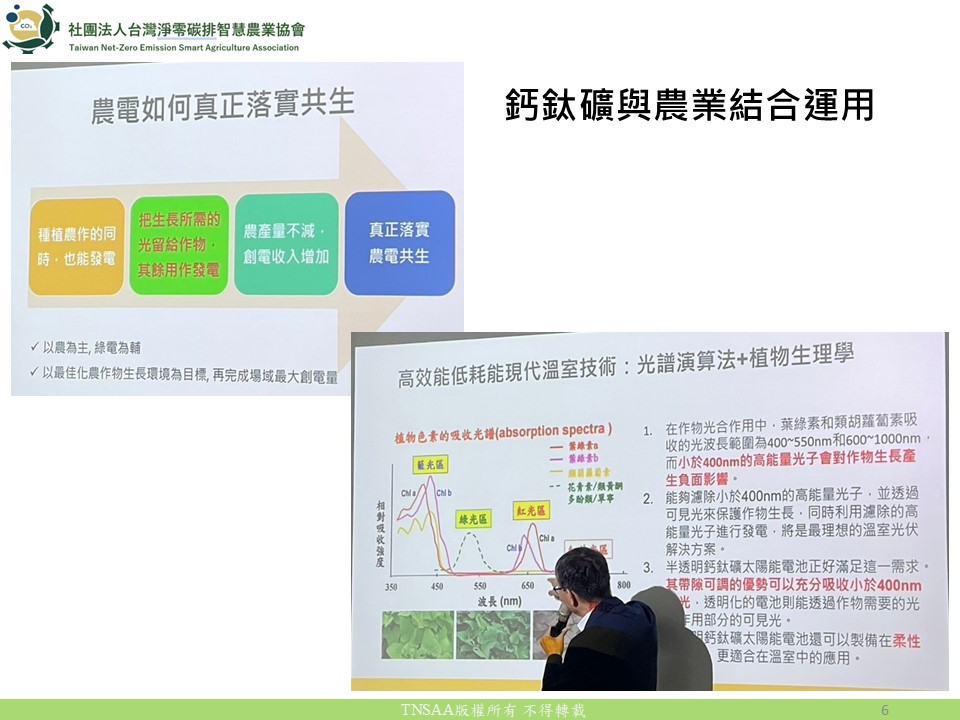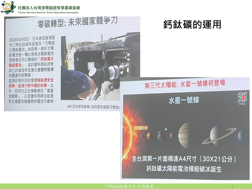 陳來助董事長介紹「鈣鈦礦的應用於淨零碳排的展望」。鈣鈦礦是綠能產業中備受矚目的技術,為大家帶來最新的產業趨勢。