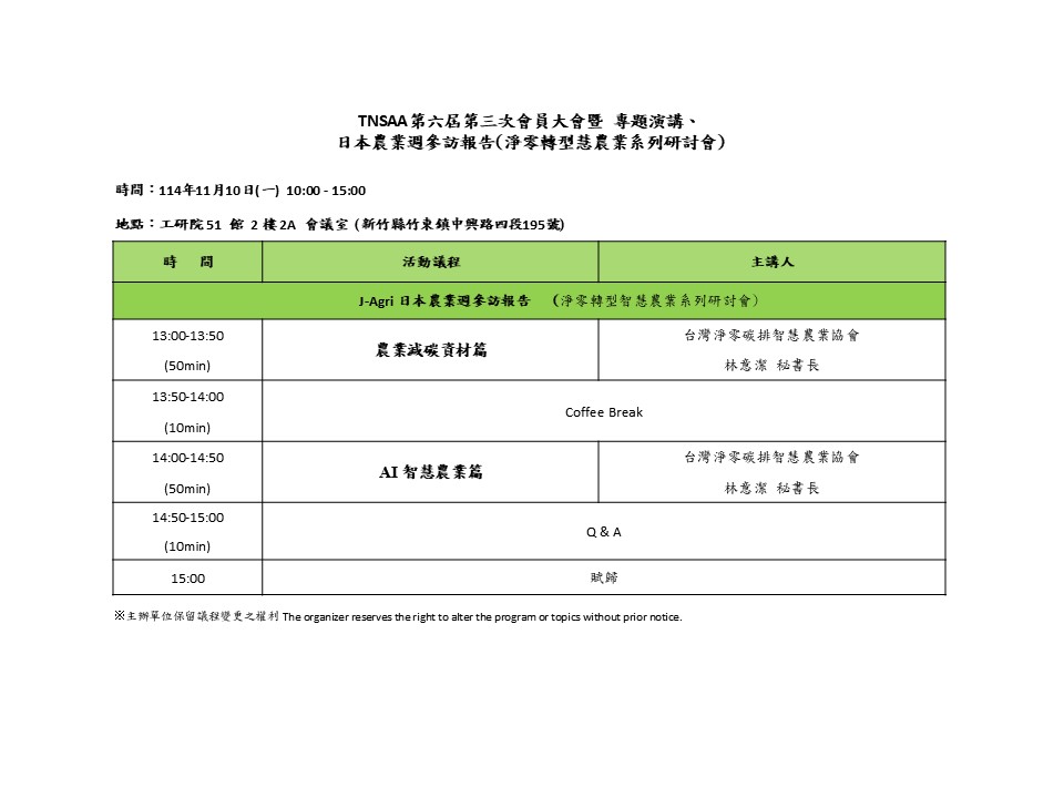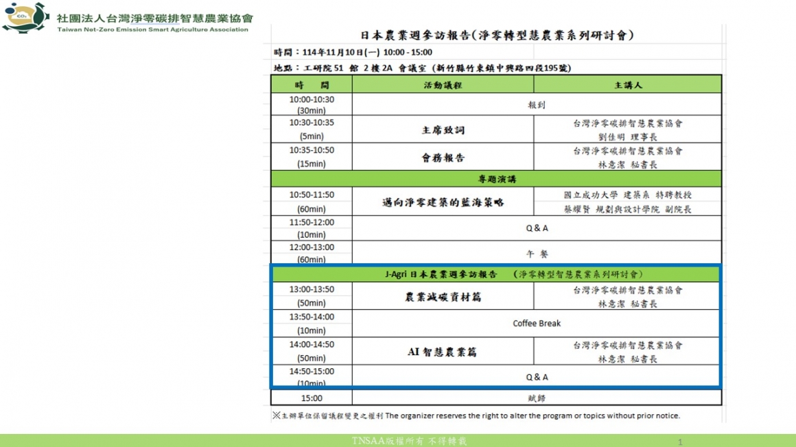 日本農業週參訪報告(淨零轉型慧農業系列研討會) [ 114.11.10 (一) 13:00 - 15:00] * J-Agri日本農業週參訪報告 (農業減碳資材篇) * J-Agri 日本農業週參訪報告 (AI 智慧農業篇)