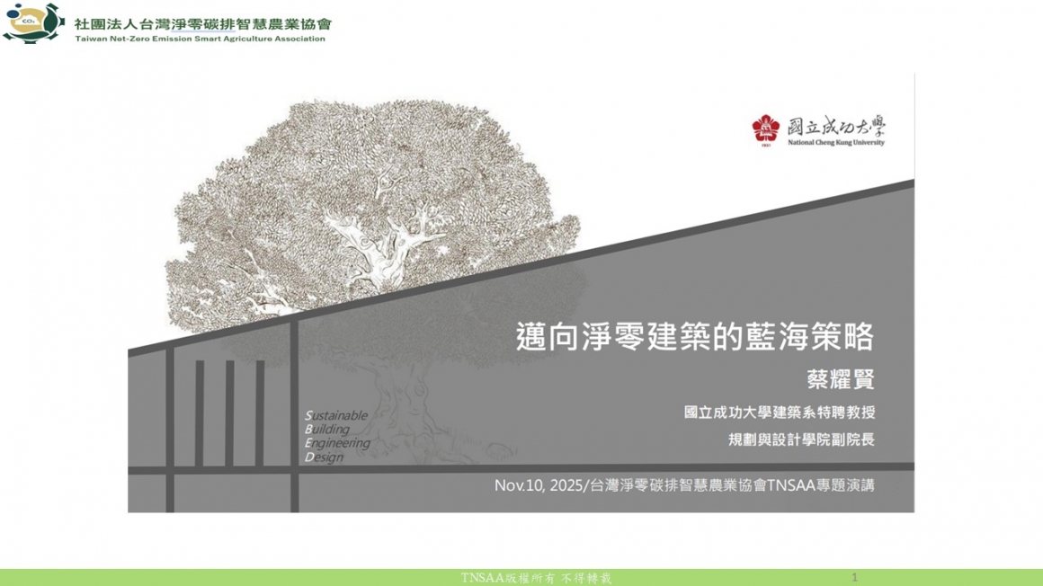 蔡耀賢教授介紹「減碳設計」到「低碳實踐」的全方位解析。 主講:國立成功大學建築學系特聘教授、規劃與設計學院副院長 蔡耀賢 教授(現任台灣室內環境品質學會理事長)